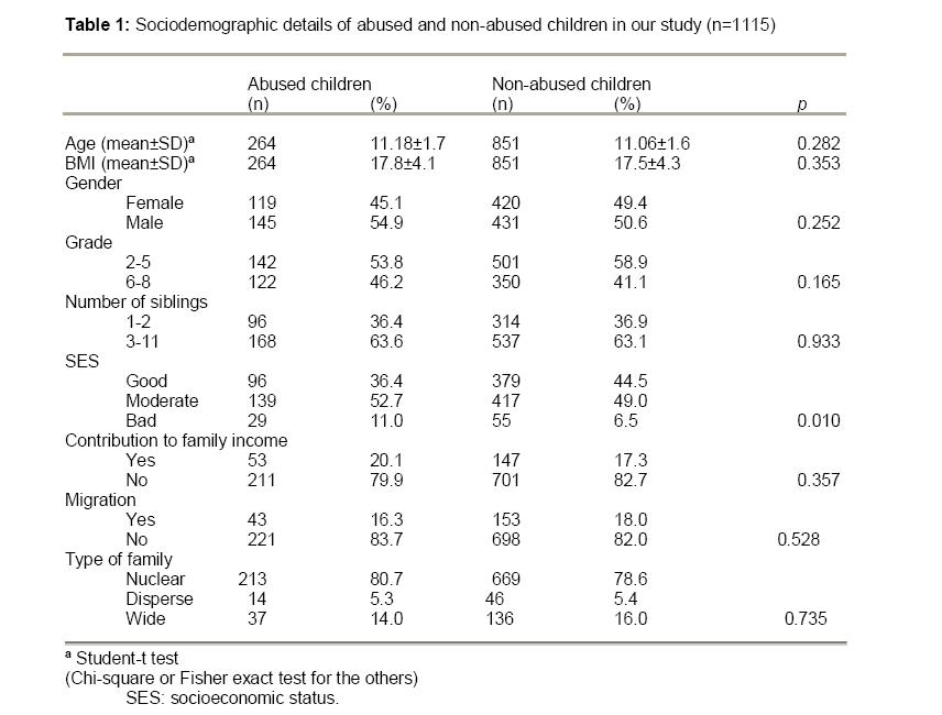 Results: Of 1115 students, 264 (23.7%) were abused. There was significant relationship between being abused and low socioeconomic status (p=0.01) and working mother (p=0.0001). Aggressive personality (p=0.02), feeling insecure (p=0.001) and the idea of leaving home (p=0.001) were more frequently observed in abused children than non-abused children. Idea of suicide in abused children was higher than non-abused children (p=0.0001). Abused children had lower academic performance at school than non-abused children (p=0.002) and had less hope for future (p=0.0001).