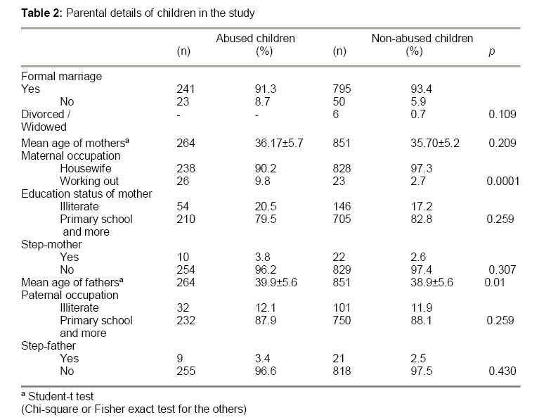The age, gender and body mass index (BMI) of abused and non-abused children were similar (Table 1). Low socioeconomic status in abused children was higher than non-abused children (p=0.010). There was significant relationship between parental occupation and child abuse (p=0.0001 for mothers, p=0.002 for fathers) (Table 2).
