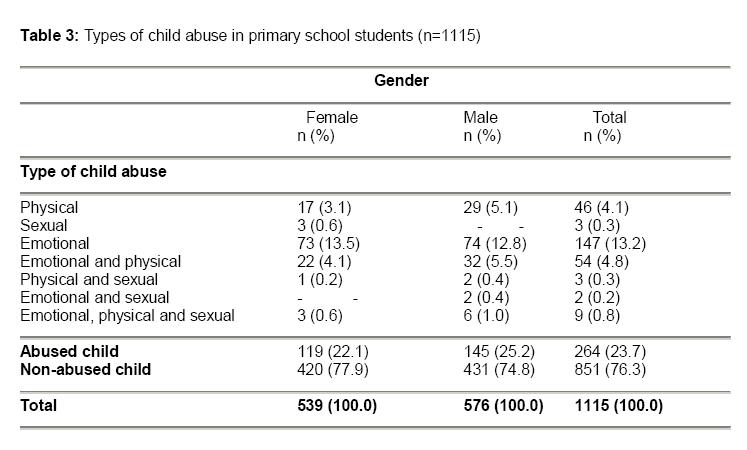 Methods: The study was conducted in five randomly selected primary schools. One thousand one hundred and fifteen students out of 1368 in grades 2-8 were included. A questionnaire including open ended questions for sociodemographic characteristics and the experience for child abuse were completed by the students. Abuse was defined in three categories as emotional, physical and sexual abuse.