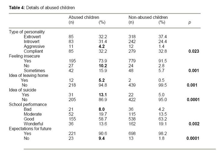 Aggressive personality (p=0.023), feeling insecure (p=0.001) and the idea of leaving home (p=0.001) and suicidal thought (p=0.0001) were more frequent in abused children than non-abused ones. School performance was lower in abused children (p=0.002) and they had less hope for future (p=0.0001) (Table 4).